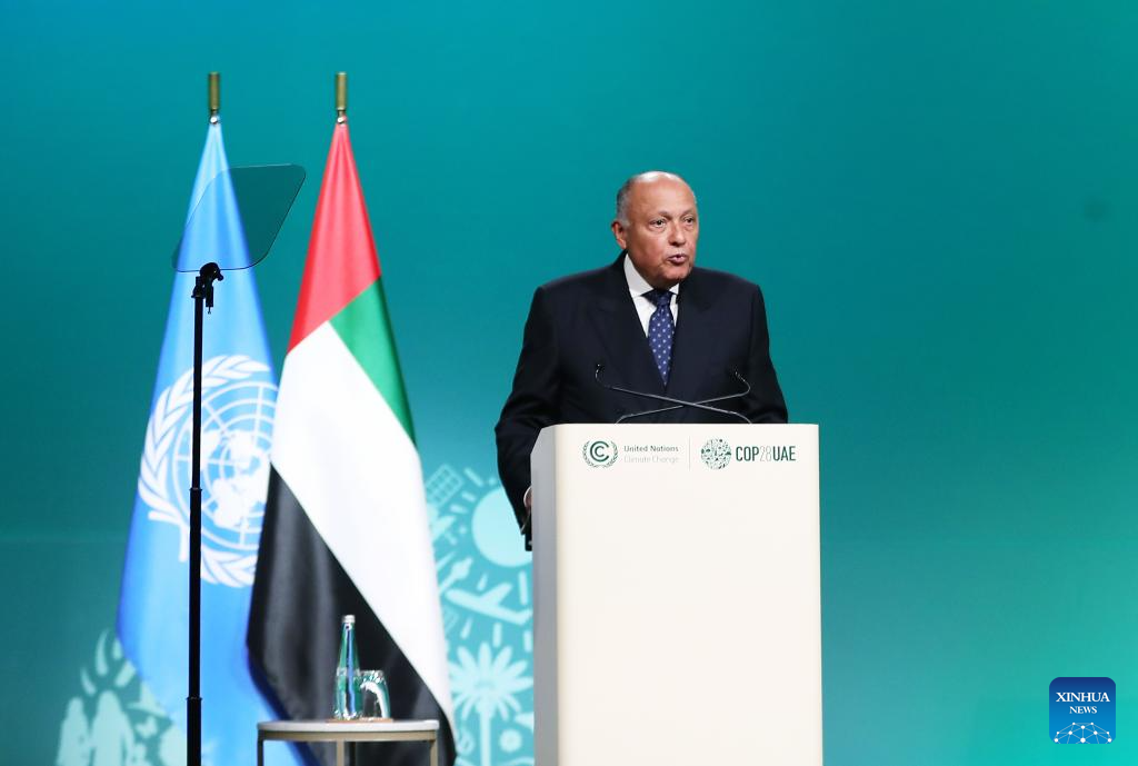 Egyptian Foreign Minister and COP27 President Sameh Shoukry addressed the opening ceremony of the 28th session of the Conference of the Parties to the United Nations Framework Convention on Climate Change, or COP28, in Dubai, the United Arab Emirates, Nov. 30, 2023. (Xinhua/Wang Dongzhen)