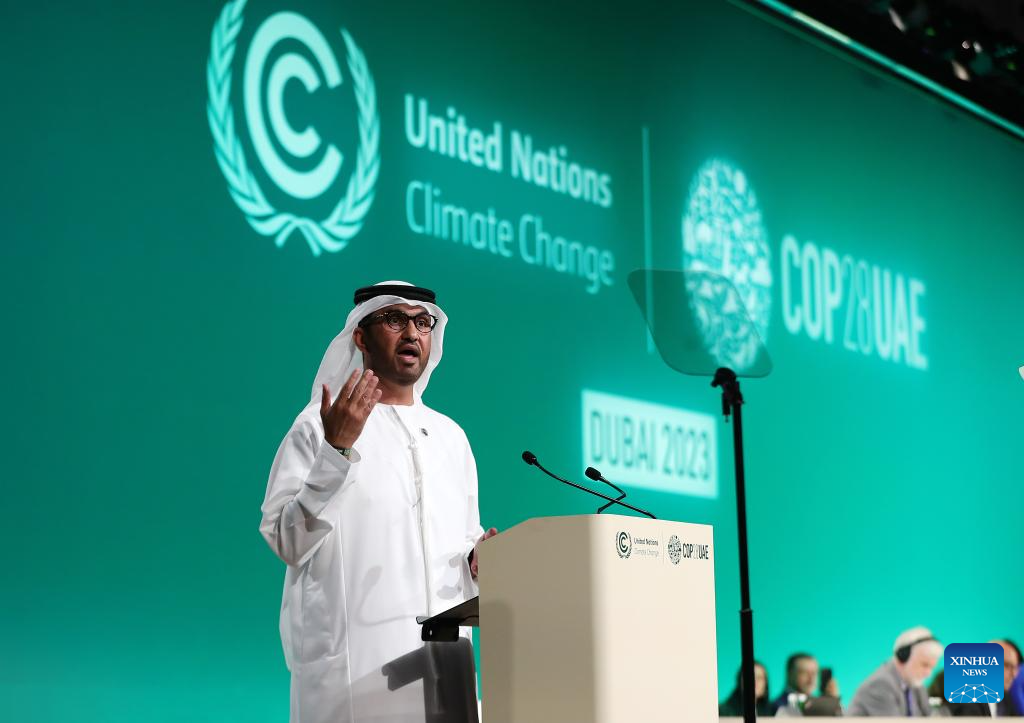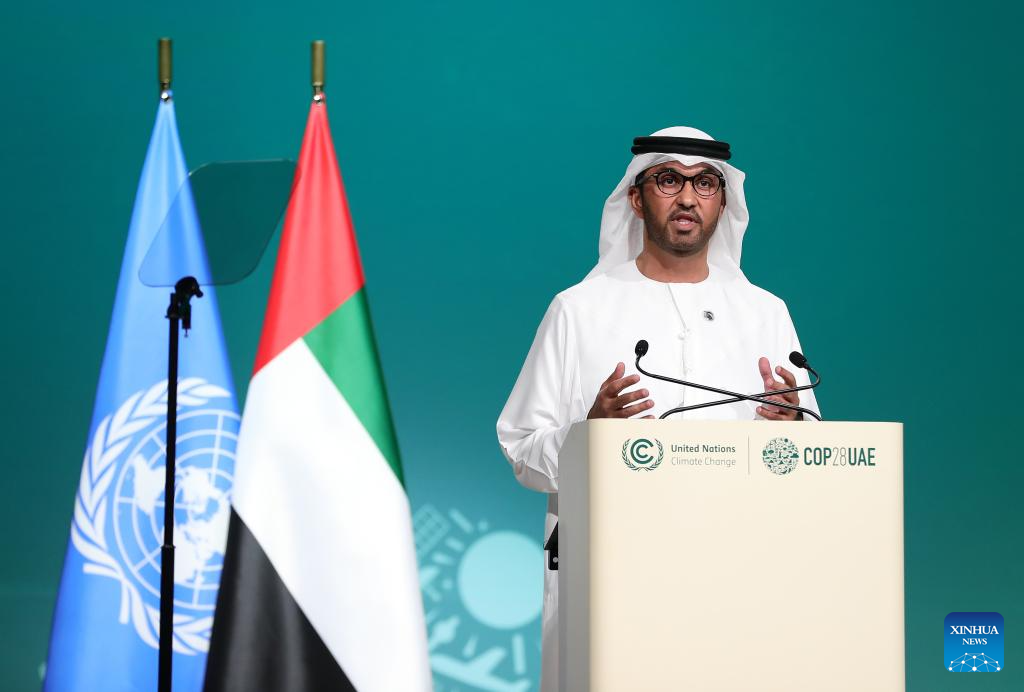 COP28 President Sultan Ahmed Al Jaber addresses the opening ceremony of the 28th session of the Conference of the Parties to the United Nations Framework Convention on Climate Change, or COP28, in Dubai, the United Arab Emirates, Nov. 30, 2023. (Xinhua/Wang Dongzhen)