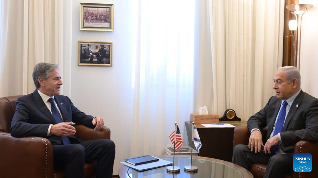 Israeli Prime Minister Benjamin Netanyahu (R) meets with U.S. Secretary of State Antony Blinken in Jerusalem, on Nov. 30, 2023. The ceasefire between Israel and Hamas continued on Thursday for the seventh day as more hostages were freed from the Gaza Strip and mediators pressed ahead with the efforts to further extend the fragile truce. (Amos Ben-Gershom/GPO/Handout via Xinhua)