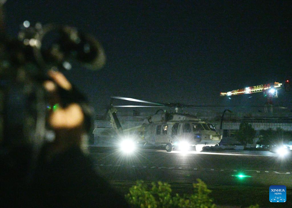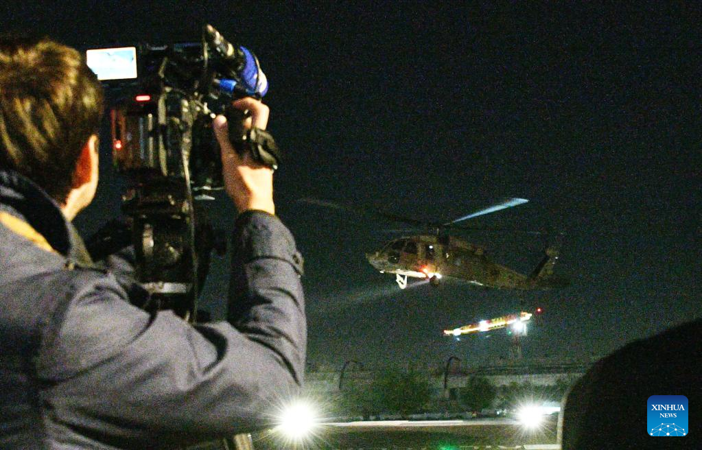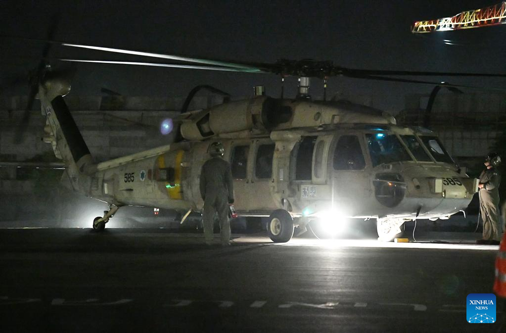 A helicopter carrying two Israeli female hostages released from the Gaza Strip arrives at a hospital in Ramat Gan, Israel, on Nov. 30, 2023. Two Israeli female hostages were released from the Gaza Strip on Thursday evening, the first two in the seventh batch of hostages to be released under an extended truce deal between Israel and Hamas. (JINI via Xinhua)
