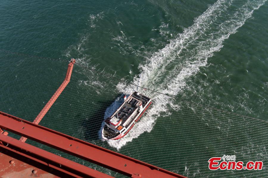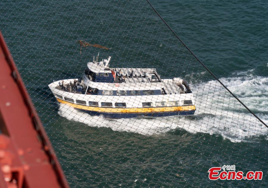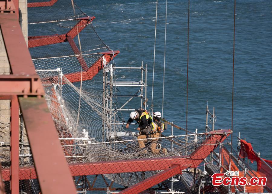 Construction workers work on the Golden Gate Bridge for the suicide prevention barrier in San Francisco, California, the United States, Nov. 30, 2023. (Photo: China News Service/Liu Guanguan)