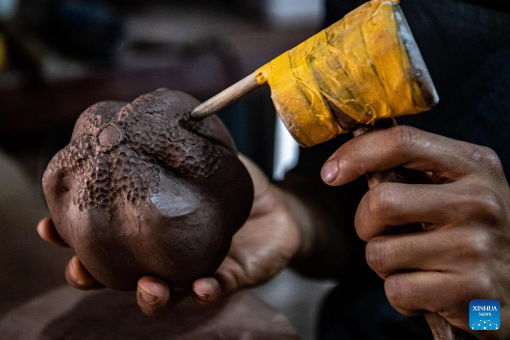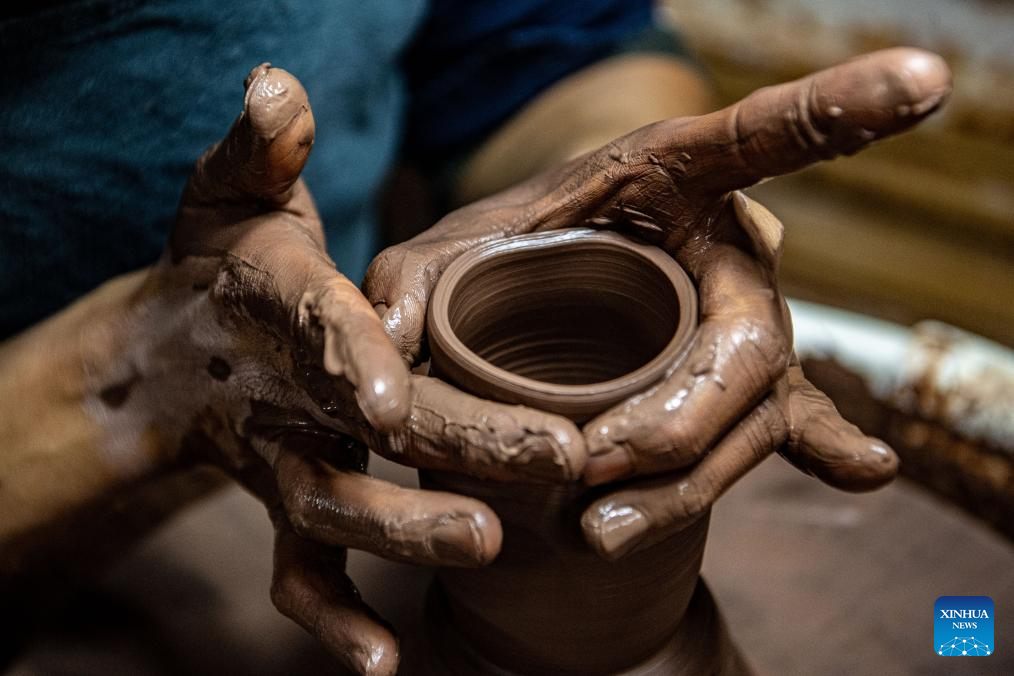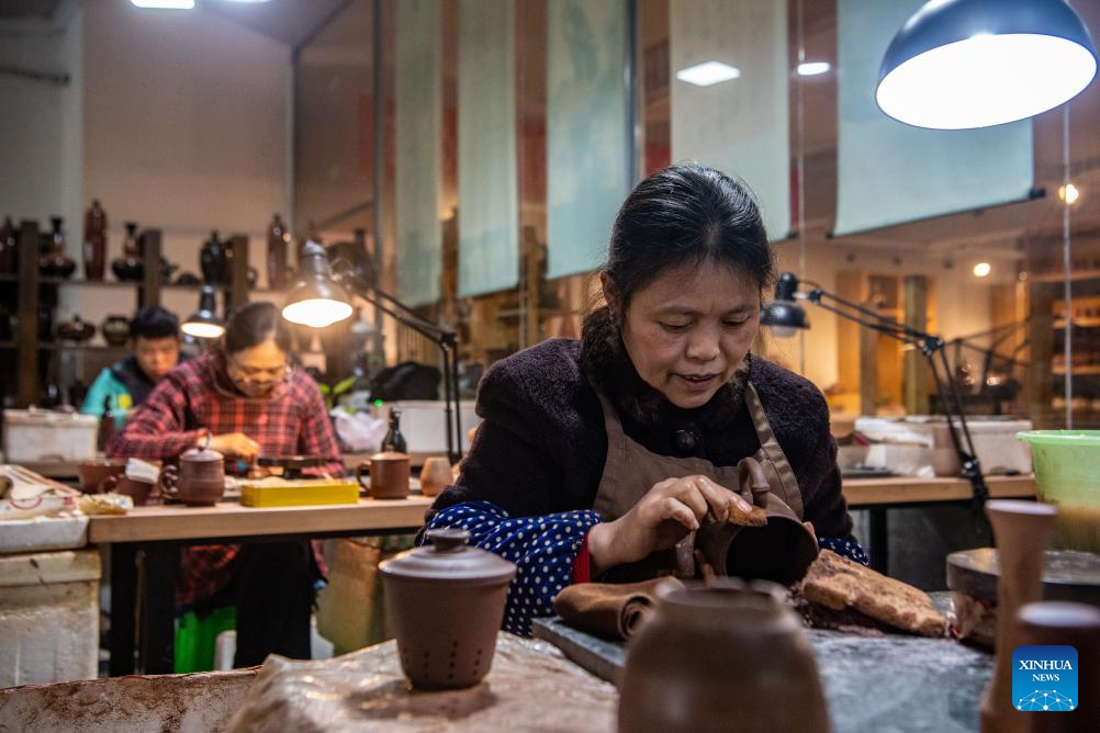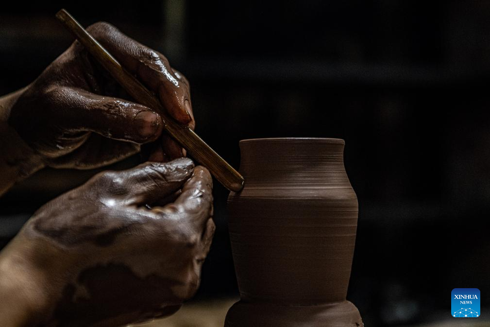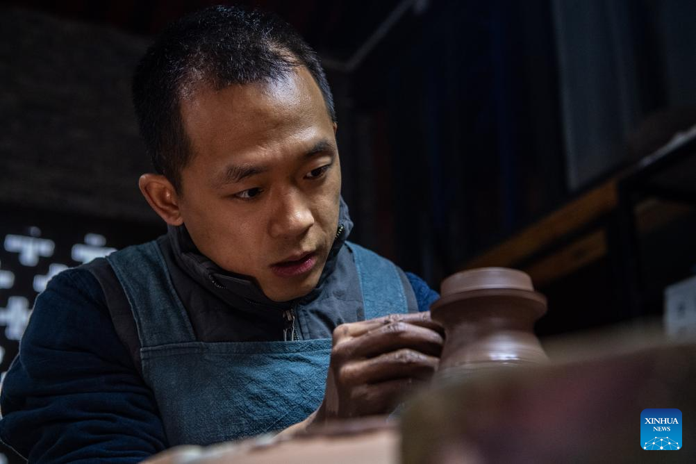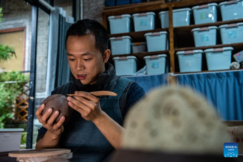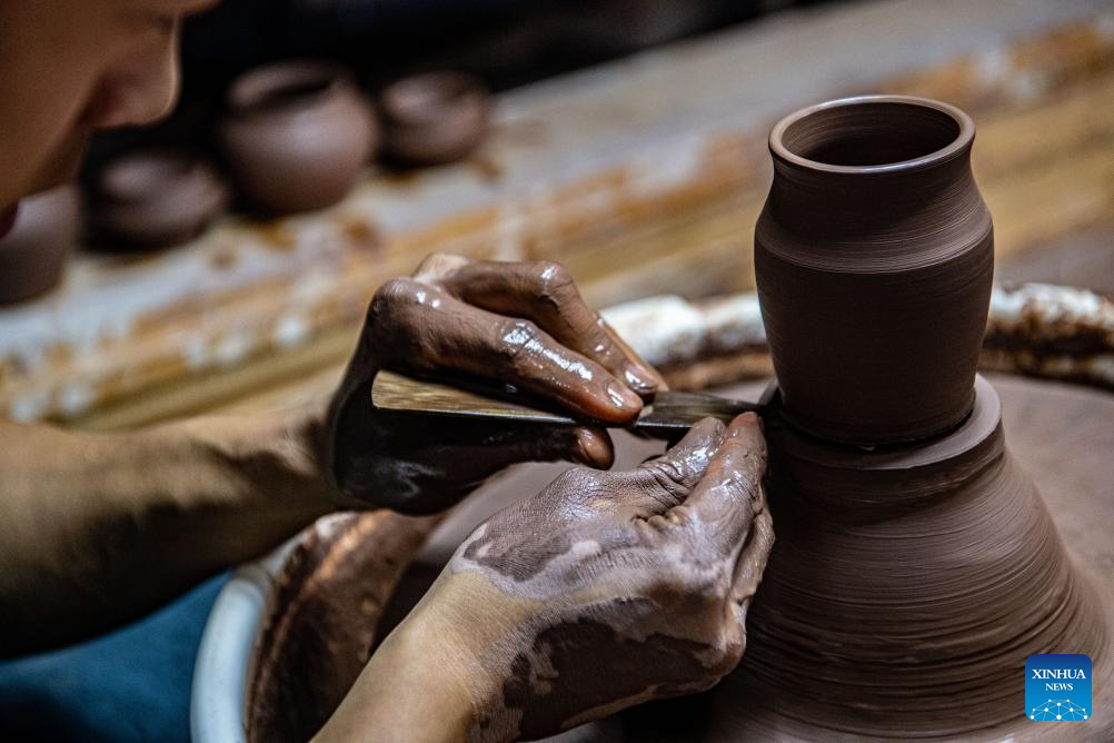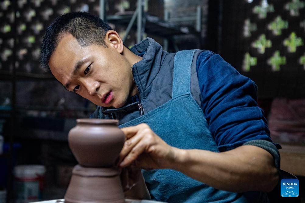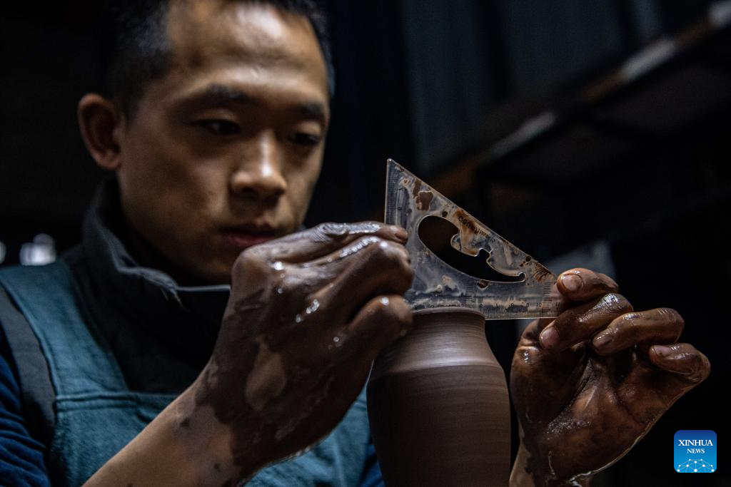 Guan Yongshuang makes a pottery artwork at his studio in Rongchang District of Chongqing, southwest China, Nov. 14, 2023. (Xinhua/Tang Yi)