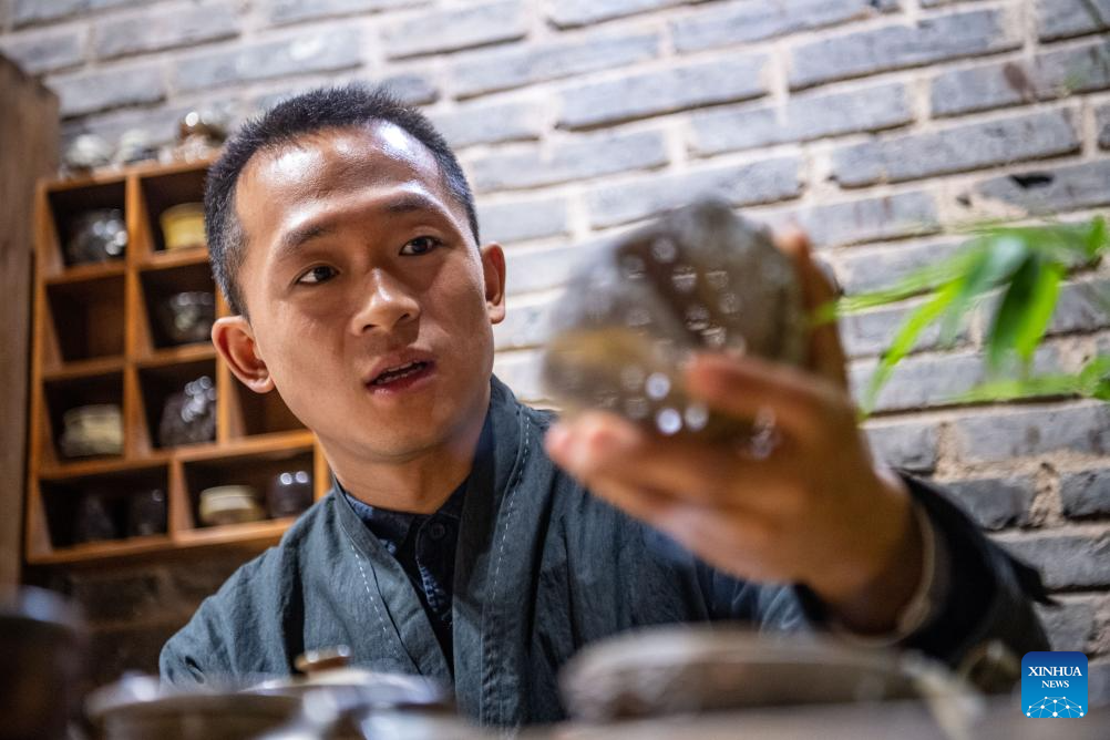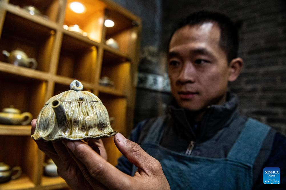 Guan Yongshuang shows a pottery artwork at his studio in Rongchang District of Chongqing, southwest China, Nov. 14, 2023. (Xinhua/Tang Yi)