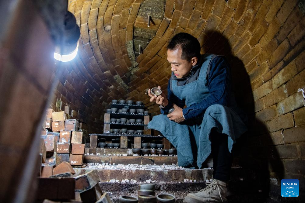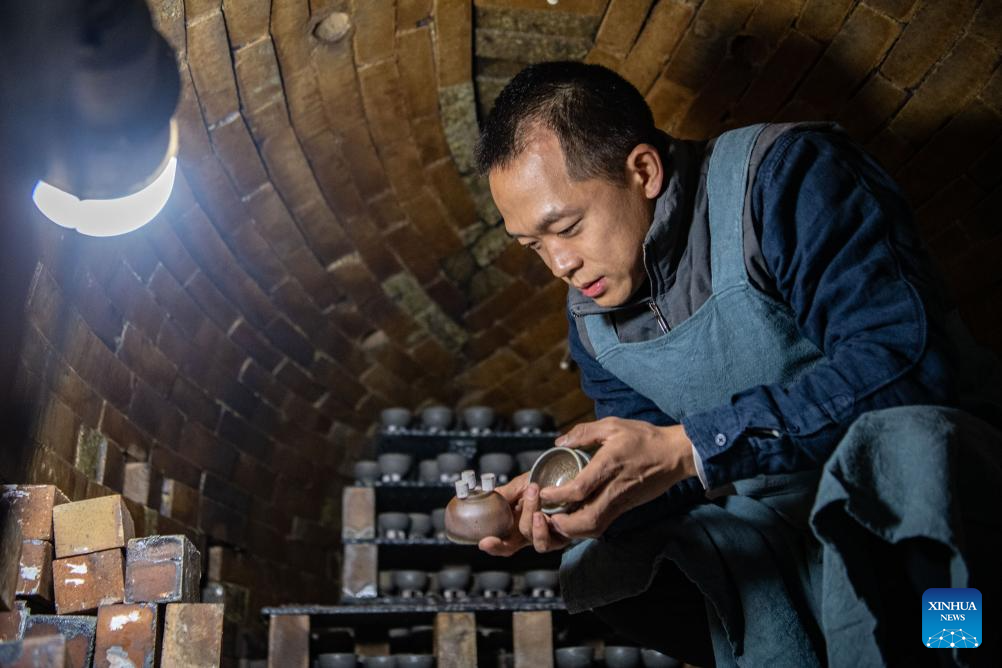 Guan Yongshuang checks the firing of pottery inside a kiln in Chongqing, southwest China, Nov. 14, 2023. (Xinhua/Tang Yi)