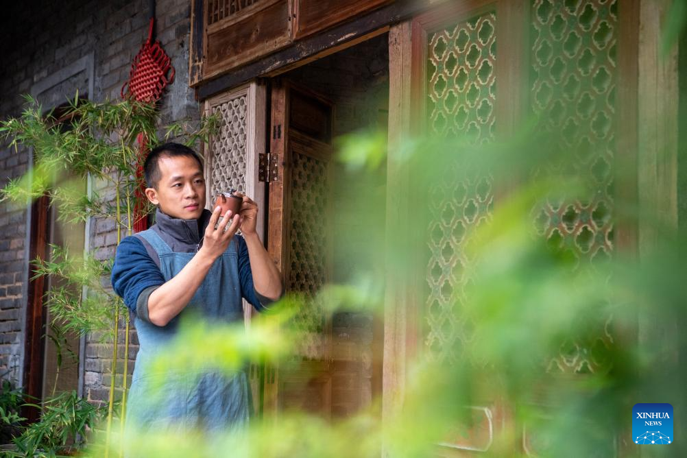 Guan Yongshuang checks a pottery artwork at his studio in Rongchang District of Chongqing, southwest China, Nov. 14, 2023. (Xinhua/Tang Yi)