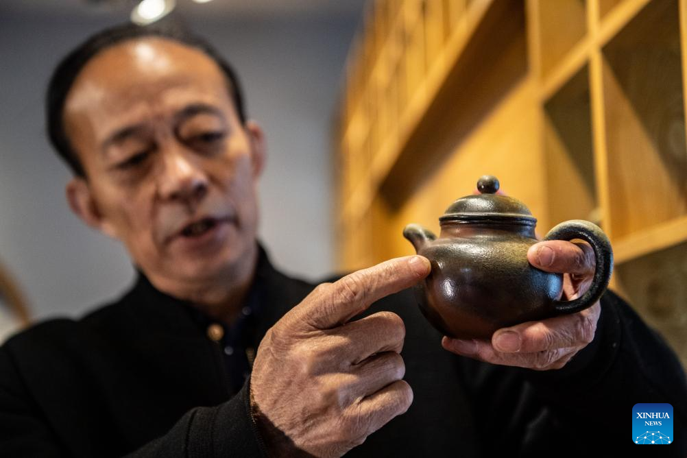 Liang Xiancai shows a pottery artwork at his studio in Rongchang District of Chongqing, southwest China, Nov. 14, 2023. (Xinhua/Tang Yi)