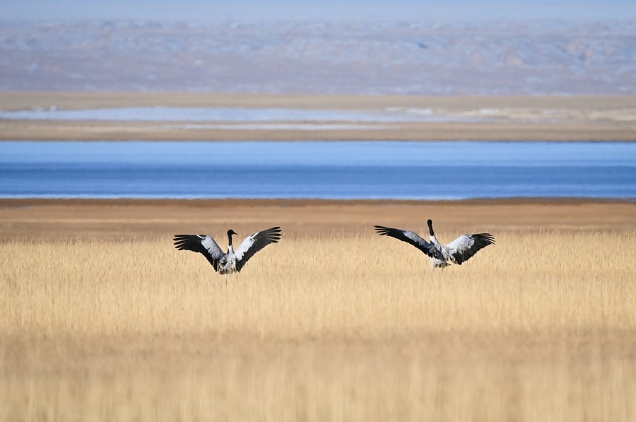 This photo taken on Oct. 18, 2023 shows black-necked cranes at the Altun Mountain National Nature Reserve in northwest China's Xinjiang Uygur Autonomous Region. (Xinhua/Li Xiang)