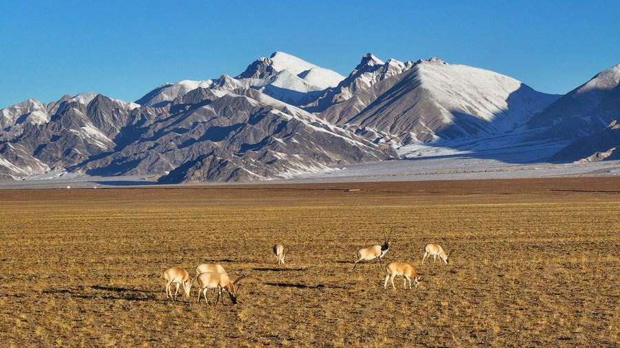 This aerial photo taken on Oct. 18, 2023 shows Tibetan antelopes foraging at the Altun Mountain National Nature Reserve in northwest China's Xinjiang Uygur Autonomous Region. (Xinhua/Li Xiang)