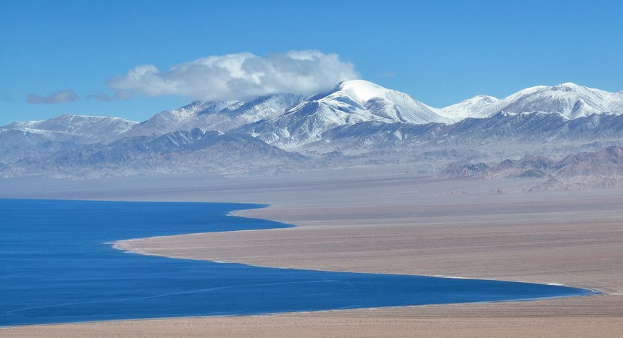 This aerial photo taken on Oct. 18, 2023 shows the Ayakumu Lake and snow-covered mountains at the Altun Mountain National Nature Reserve in northwest China's Xinjiang Uygur Autonomous Region. (Xinhua/Li Xiang)