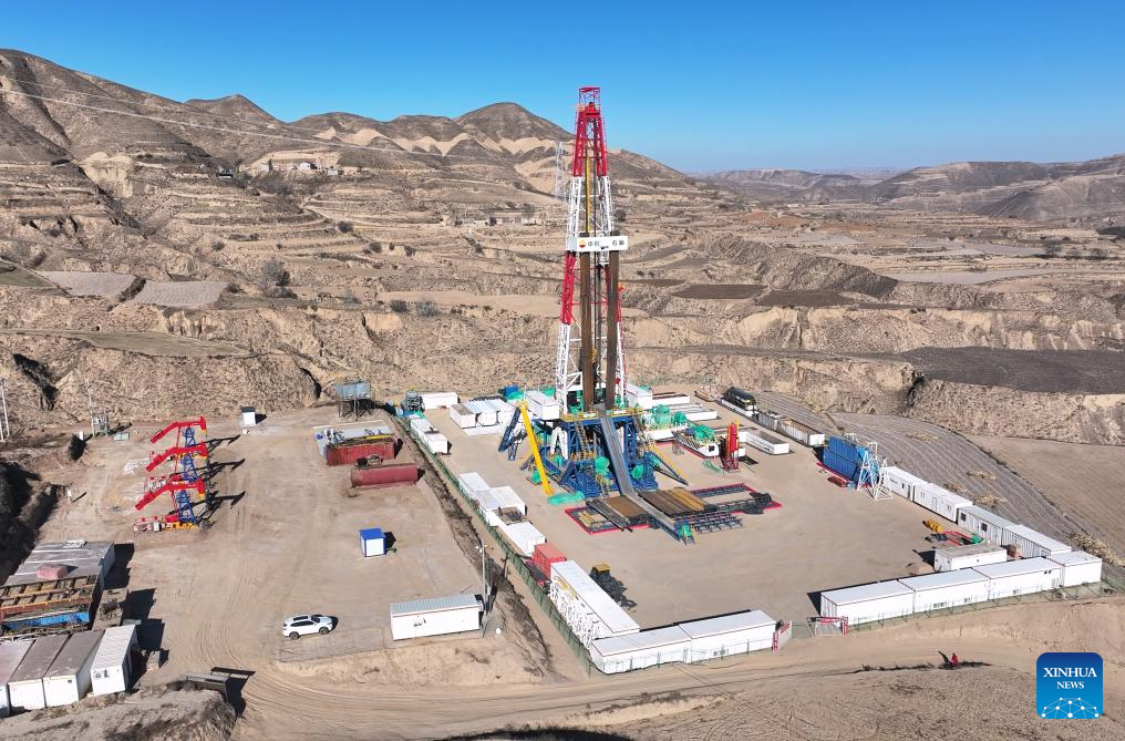 This aerial photo taken on Nov. 30, 2023 shows a drilling site of Hongde oilfield in Huanxian County of northwest China's Gansu Province. Changqing Oilfield, a branch of PetroChina, has discovered a large-scale, well-preserved oilfield with geological reserves of over 100 million tonnes in the county. (Changqing Oilfield/Handout via Xinhua)