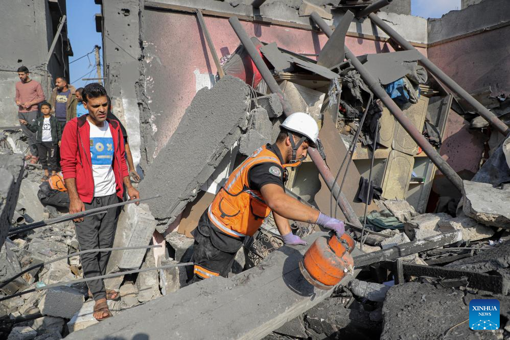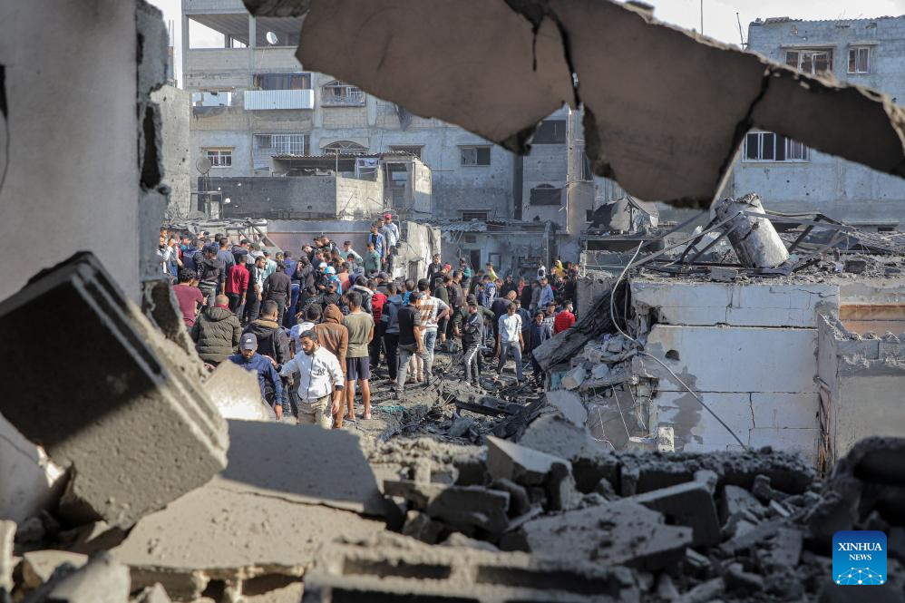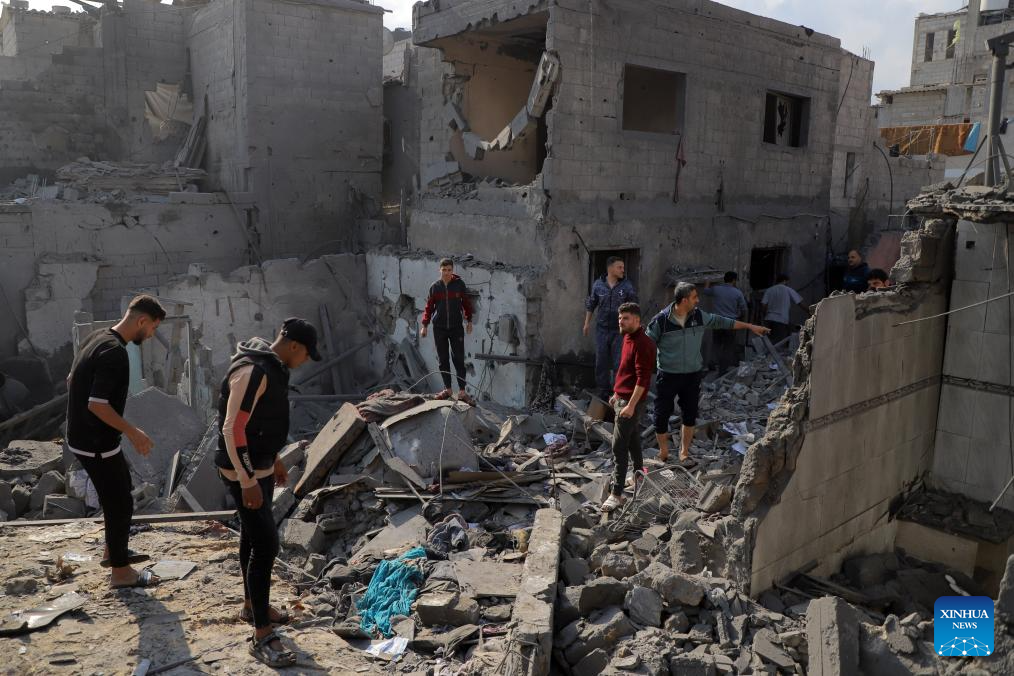 People inspect a building destroyed during Israeli air strikes in the southern Gaza Strip city of Khan Younis, Dec. 1, 2023. (Photo by Rizek Abdeljawad/Xinhua)