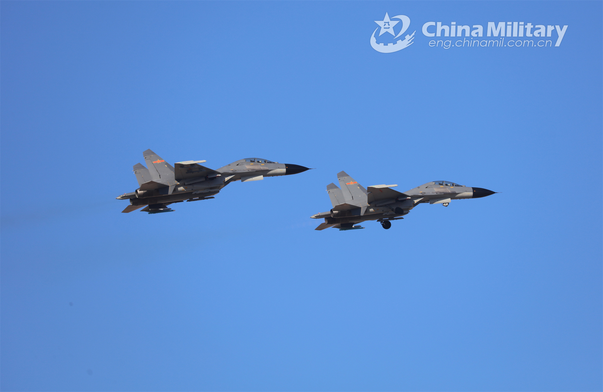 Fighter jets attached to an aviation brigade of the air force under the PLA Western Theater Command soar in the sky during a round-the-clock flight training exercise on November 26, 2023. (eng.chinamil.com.cn/Photo by Yu Zeqi)