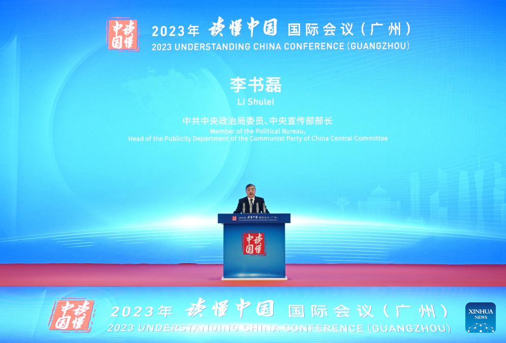 Li Shulei, a member of the Political Bureau of the Communist Party of China (CPC) Central Committee and head of the Publicity Department of the CPC Central Committee, reads a congratulatory letter from President Xi Jinping and delivers a keynote speech at the opening ceremony of the 2023 Understanding China Conference (Guangzhou) in Guangzhou, south China's Guangdong Province, Dec. 2, 2023. The conference is being held from Friday to Sunday in Guangzhou, under the theme of "China's New Endeavors amid Unprecedented Global Changes -- Expanding the Convergence of Interests and Building A Community of Shared Future." (Xinhua/Zhang Ling)