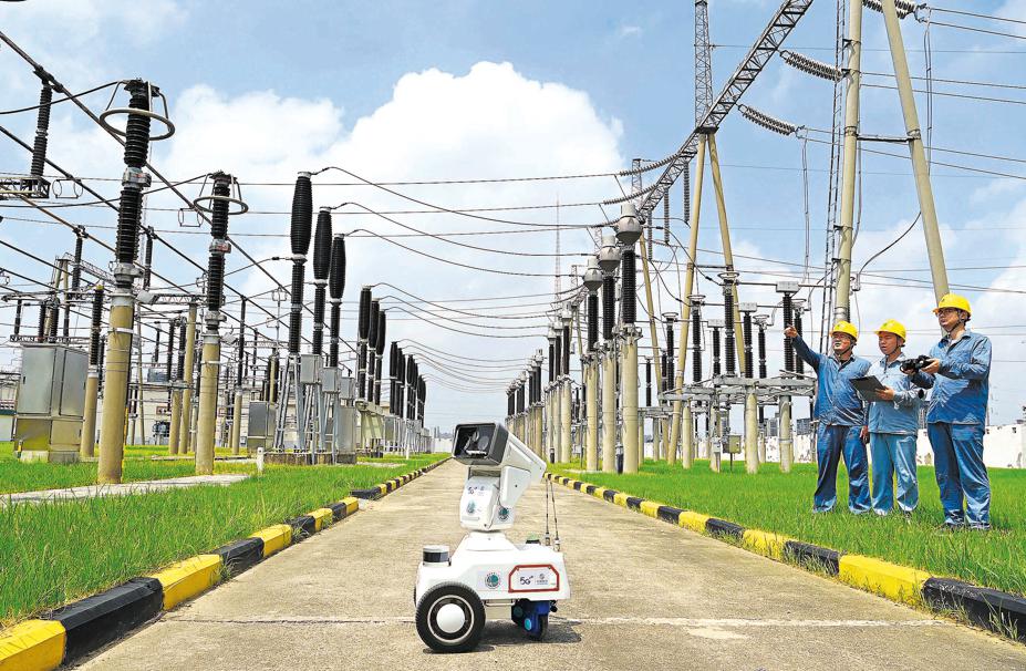 A 5G-linked robot conducts a safety inspection at a power grid station in Chuzhou, Anhui province, in August. SONG WEIXING/FOR CHINA DAILY