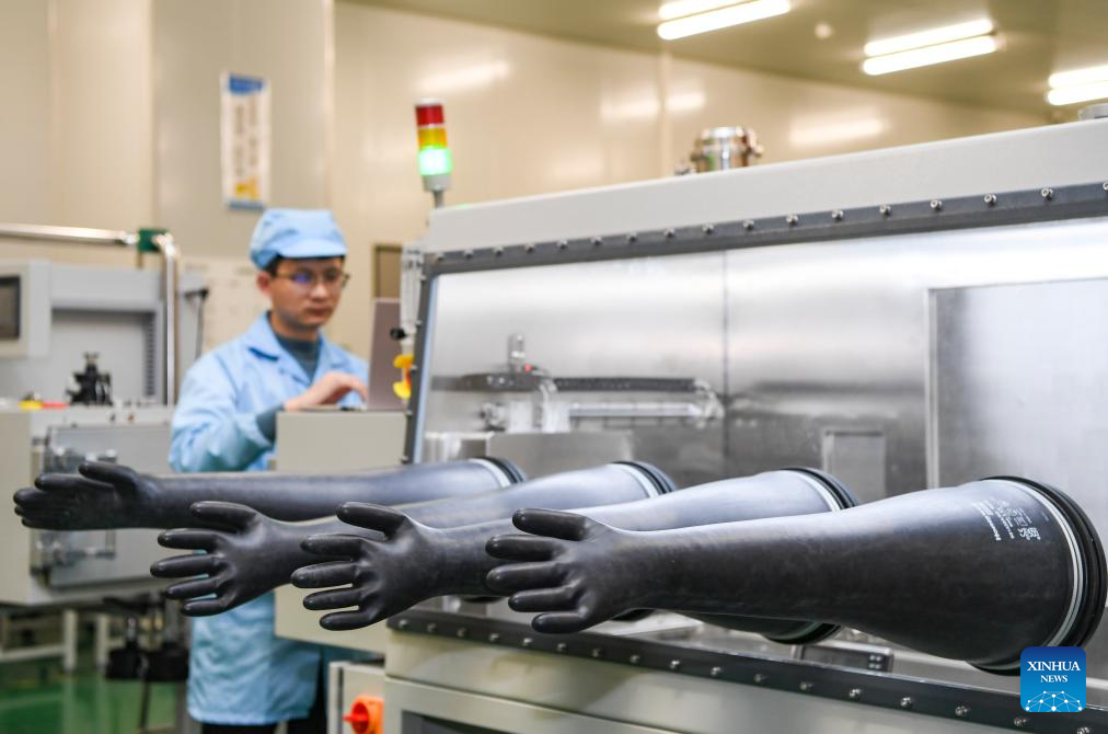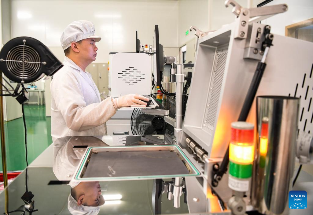 A worker is seen at a testing workshop of a technology company at a sensor industrial park in Chongqing, southwest China, Nov. 30, 2023. In recent years, the Beibei District of Chongqing has worked together with China Railway Construction Corporation Limited (CRCC) in building a sensor industrial park. By introducing preferential policies, support funds and investment, the park is aimed at promoting the intelligent sensor industry to develop in a large-scale, specialized, differential and high-end way. (Xinhua/Wang Quanchao)