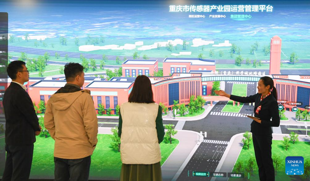 A staff member (1st R) of China Railway Construction Corporation Limited (CRCC) introduces to visitors the operation of a sensor industrial park in Chongqing, southwest China, Nov. 30, 2023. In recent years, the Beibei District of Chongqing has worked together with China Railway Construction Corporation Limited (CRCC) in building a sensor industrial park. By introducing preferential policies, support funds and investment, the park is aimed at promoting the intelligent sensor industry to develop in a large-scale, specialized, differential and high-end way. (Xinhua/Wang Quanchao)