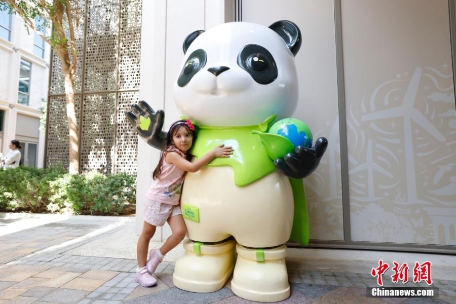 A girl poses for photos with an eye-catching panda mascot at the China Pavilion during the 28th session of the Conference of the Parties (COP28), in the Expo City of Dubai, the United Arab Emirates, Dec. 2, 2023. (Photo: China News Service/Han Haidan)