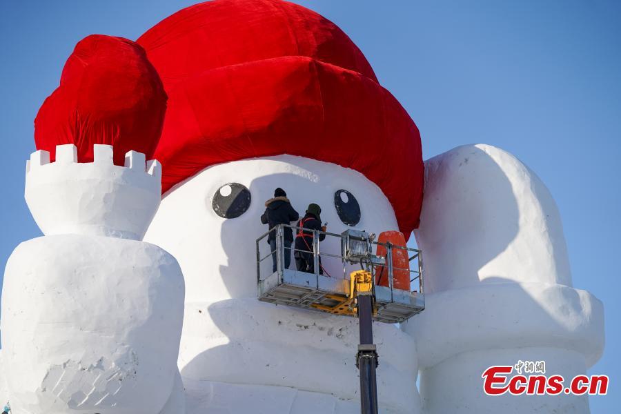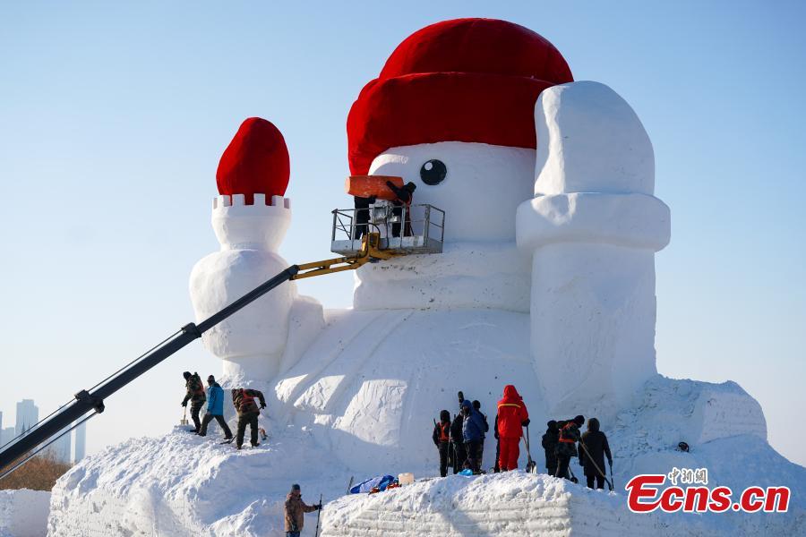 A landmark snowman is under construction in Harbin, northeast China's Heilongjiang Province, Dec. 3, 2023. (Photo: China News Service/Zhao Yuhang)