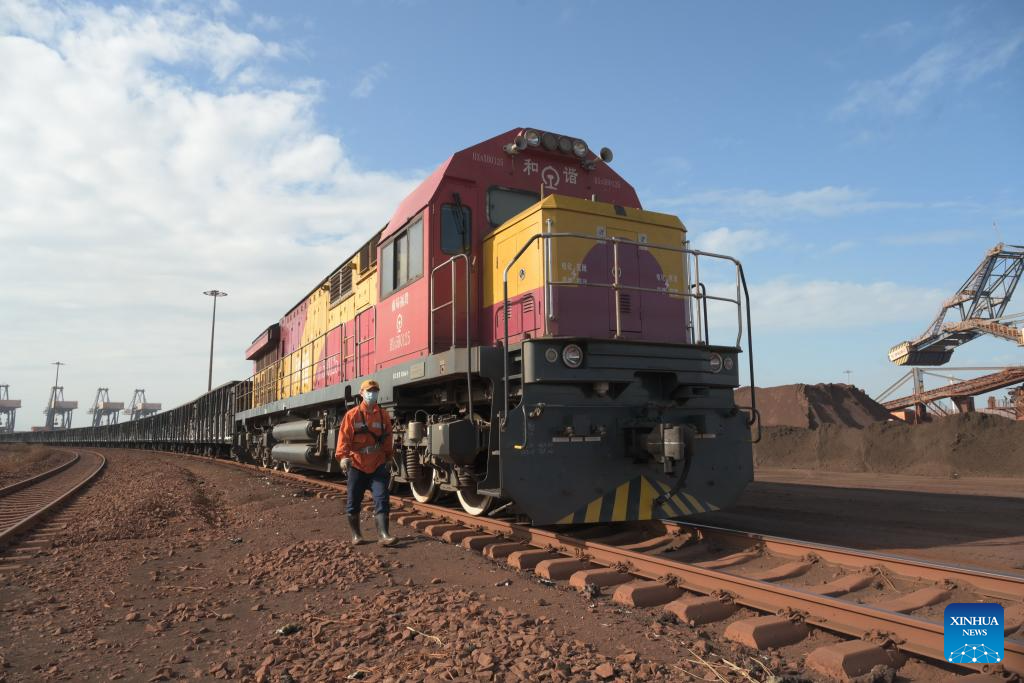 This photo taken on Nov. 29, 2023 shows a sea-rail intermodal train used for transporting iron ore at the Luoyu operating area in Meizhou Bay of Putian City, southeast China's Fujian Province. Ports constitute an important economic activity in coastal province Fujian, a core area in the construction of the 21st Century Maritime Silk Road. Fujian has seen improving ability in serving the Belt and Road (B&R) Initiative. (Xinhua/Lin Shanchuan)