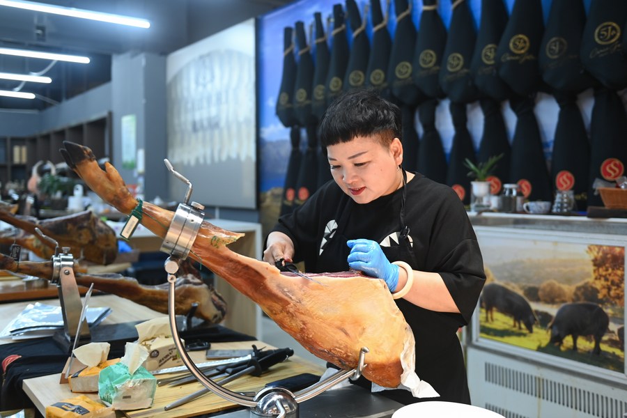 A shop owner of Spanish goods slices Iberian ham at the Yiwu International Trade Market in Yiwu, east China's Zhejiang Province, July 18, 2023. (Xinhua/Huang Zongzhi)