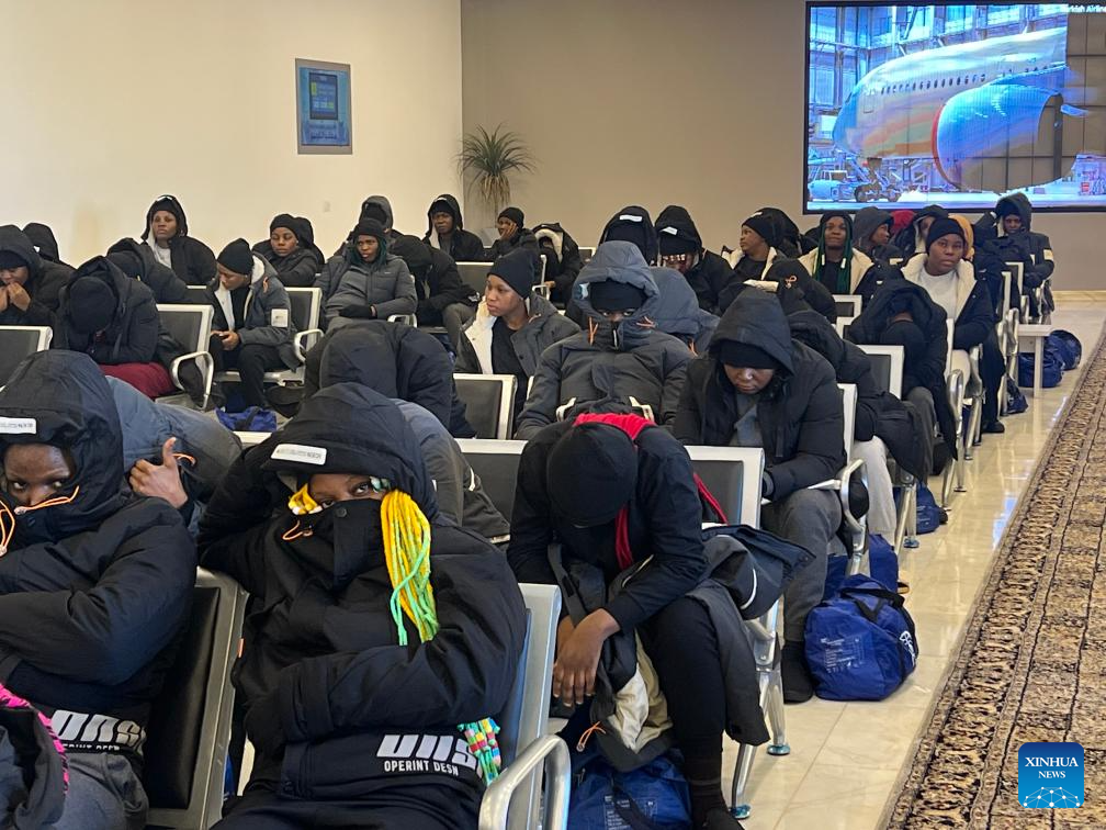 Illegal migrants wait to depart at the Libyan Illegal Migration Control Department in Tripoli, Libya, on Dec. 4, 2023. The Libyan Illegal Migration Control Department on Monday announced the deportation of 147 illegal migrants back to Nigeria. (Photo by Hamza Turkia/Xinhua)