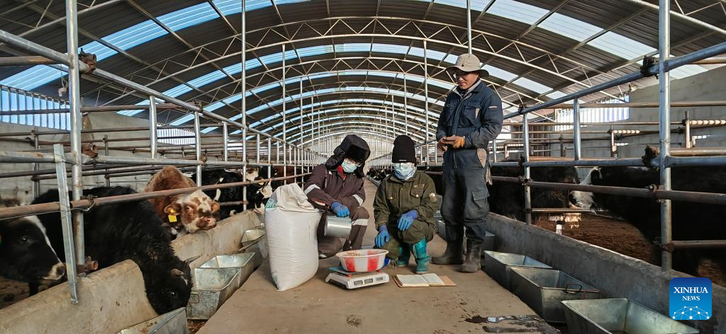 Jing Xiaoping (1st R) and his team members prepare well-proportioned forage for yaks in Maqu County, Gannan Tibetan Autonomous Prefecture of northwest China's Gansu Province, Nov. 7, 2023. (Xinhua/Wen Jing)