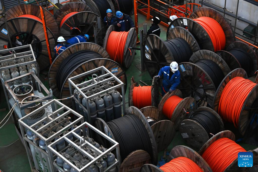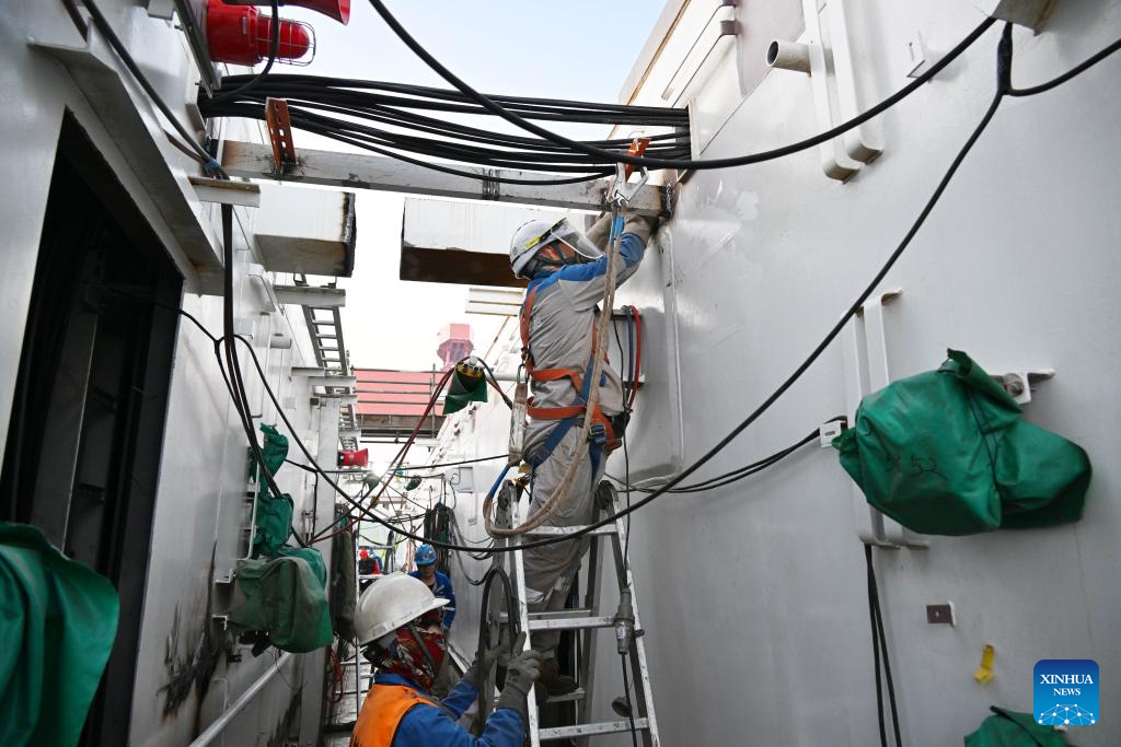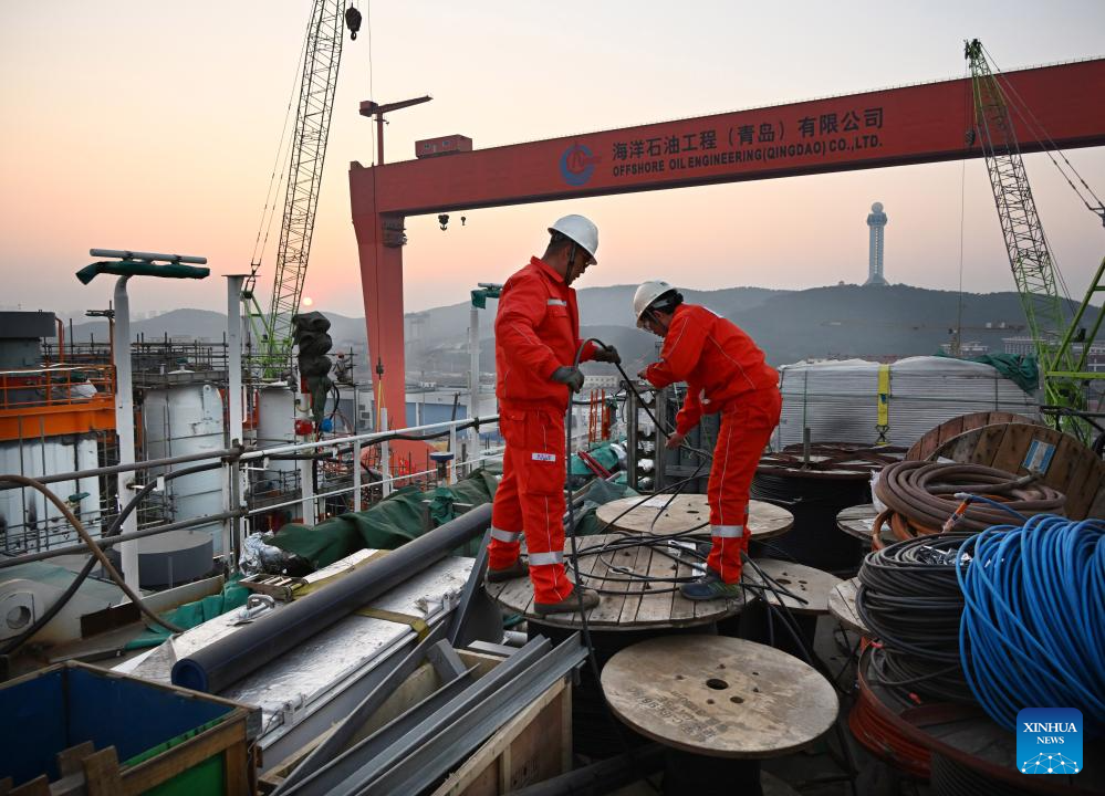 Workers snake wires on Haiyang Shiyou 122, Asia's first cylindrical floating, production, storage, and offloading (FPSO) facility, in Qingdao, east China's Shandong Province, Dec. 4, 2023. Designed and manufactured in China, Haiyang Shiyou 122 has entered its final assembly phase recently in Qingdao. With a diameter of about 90 meters and designed displacement of 100,000 tonnes, the facility is capable of operating for 15 years at sea without returning to the dry dock. (Xinhua/Li Ziheng)