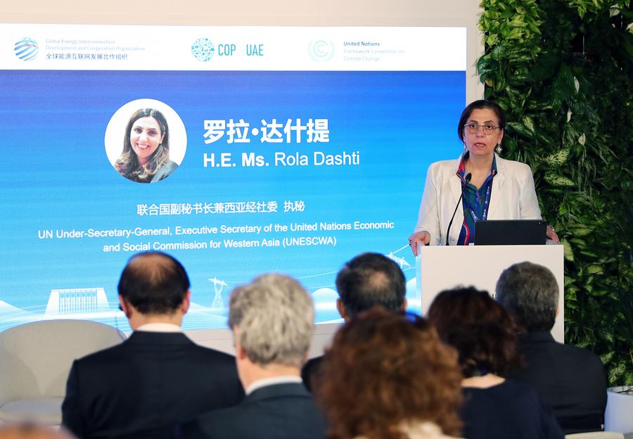 Rola Dashti, the executive secretary of the UN Economic and Social Commission for Western Asia (UNESCWA), speaks at an energy-themed gathering in Dubai, the United Arab Emirates, Dec. 5, 2023. (Xinhua/Wang Dongzhen)