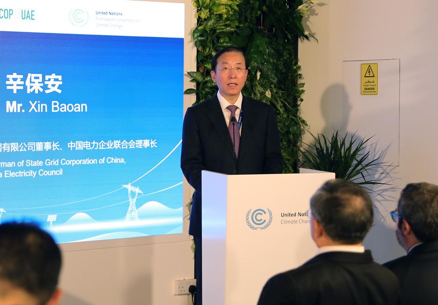 Xin Baoan, chief of the Global Energy Interconnection Development and Cooperation Organization (GEIDCO) and executive chairman of State Grid Corporation of China, speaks at an energy-themed gathering in Dubai, the United Arab Emirates, Dec. 5, 2023. (Xinhua/Wang Dongzhen)