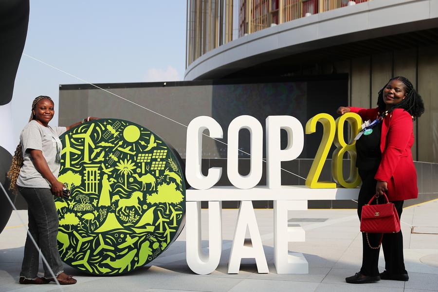 Visitors pose for photos at the Green Zone of the 28th session of the Conference of the Parties to the United Nations Framework Convention on Climate Change (COP28), in Dubai, the United Arab Emirates, Dec. 3, 2023. (Xinhua/Wang Dongzhen)