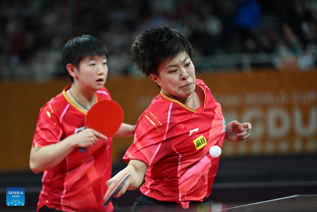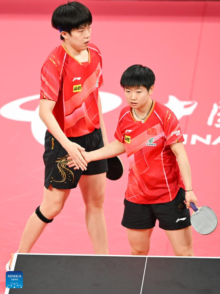 Wang Yidi (R)/Sun Yingsha of China compete during the stage 1 group 1 women's doubles match against Adriana Diaz/Melanie Diaz of Puerto Rico at the ITTF Mixed Team World Cup 2023 in Chengdu, southwest China's Sichuan Province, Dec. 5, 2023. (Xinhua/Xu Bingjie)