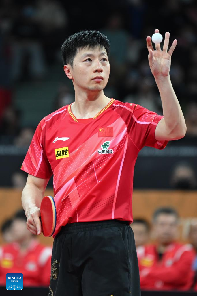 Ma Long of China competes during the stage 1 group 1 men's singles match against Angel Naranjo of Puerto Rico at the ITTF Mixed Team World Cup 2023 in Chengdu, southwest China's Sichuan Province, Dec. 5, 2023. (Xinhua/Wang Xi)