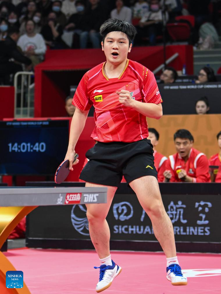 Fan Zhendong of China celebrates during the stage 1 group 1 men's singles match against Wong Chun Ting of China's Hong Kong at the ITTF Mixed Team World Cup 2023 in Chengdu, southwest China's Sichuan Province, Dec. 5, 2023. (Xinhua/Xu Bingjie)