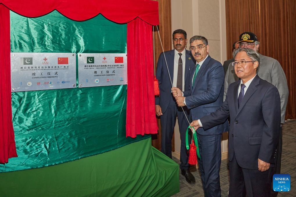 Pakistani Prime Minister Anwar-ul-Haq Kakar (2nd R, front) and Chinese Ambassador to Pakistan Jiang Zaidong (1st R, front) attend the inauguration ceremony of the China-aided desalination project and upgrade of the Pak-China Friendship Hospital in Gwadar, Pakistan, Dec. 4, 2023. The China-donated seawater desalination plant will resolve the water shortage in Gwadar district of Pakistan's southwestern Balochistan province, which has been the biggest problem in the area for many years, Pakistani Prime Minister Anwar-ul-Haq Kakar has said. (Xinhua/Tang Binhui)
