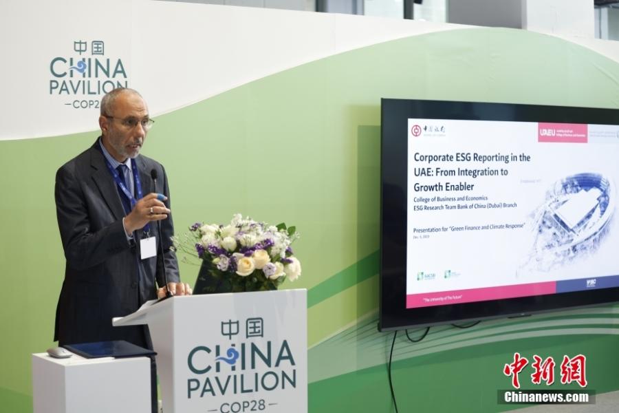 Mohamed Madi, Dean of College of Business and Economics of UAE University, delivers a speech at a side event on green finance and climate change during the 28th Conference of the Parties to the United Nations Framework Convention on Climate Change (COP28) held in Dubai, the United Arab Emirates, Dec. 5, 2023. (Photo: China News Service/Han Haidan)