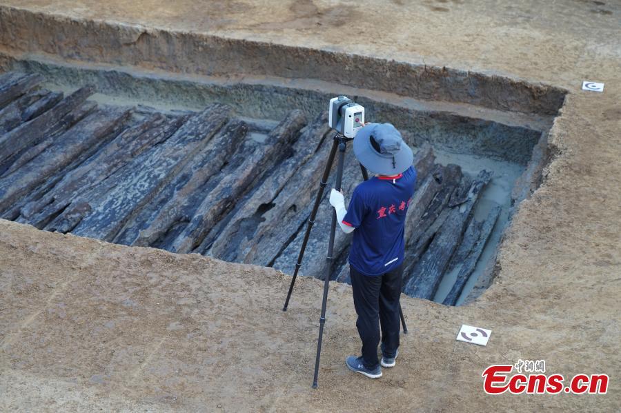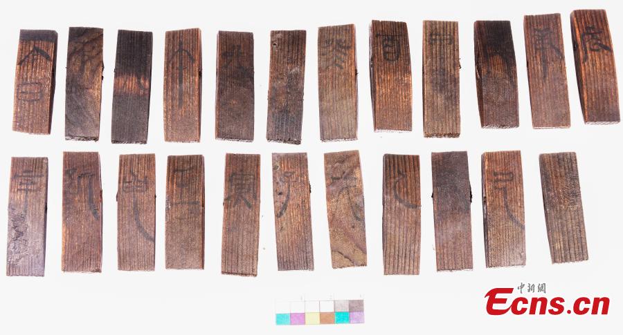 Wood slips are unearthed from a tomb dating back to the Western Han Dynasty (202 B.C.-25 A.D.) in Wulong district of Chongqing, Dec. 5, 2023. (Photo provided to China News Service)