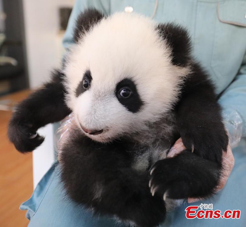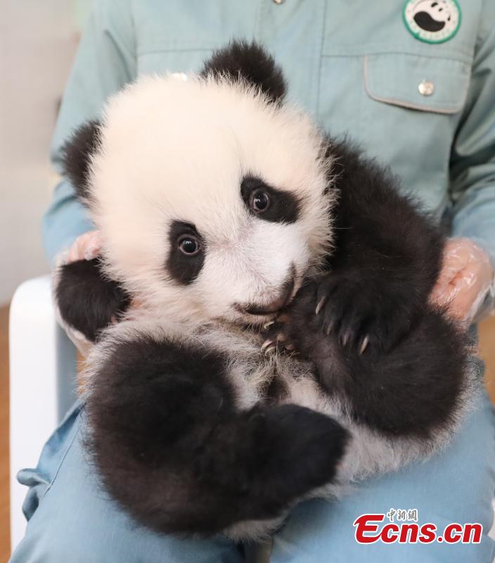 A staff member holds giant panda cub An An at the Research Center for Qinling Giant Panda, one of China's major giant panda breeding and research bases, in northwest China's Shaanxi Province, Dec. 5, 2023. (Photo: China News Service/Xu Guanglan)