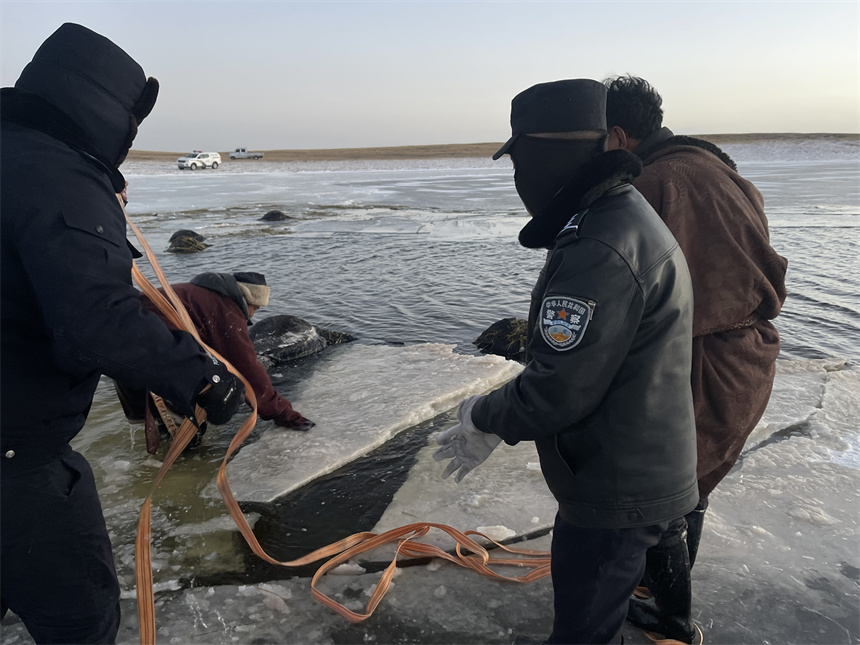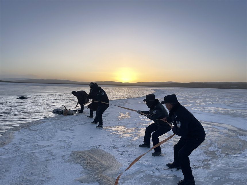 Rescuing the yaks was no easy task. Madoi, which means "the source of Yellow River" in Tibetan, is one of the highest counties in the country, with an average altitude of 4,300 meters. In late November, temperatures in the county dropped to minus 20 degrees Celsius, freezing the lake water solid.