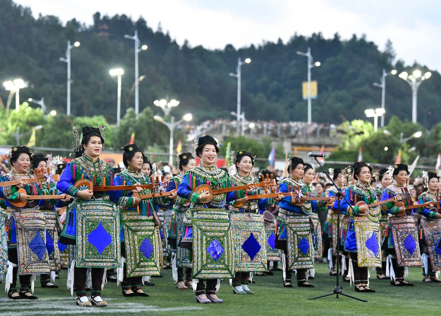 Villagers of Dong ethnic group wearing festive ethnic dress perform singing during the halftime of the "Village Super League" football match in Rongjiang County of southwest China's Guizhou Province, June 17, 2023. (Xinhua/Yang Wenbin)
