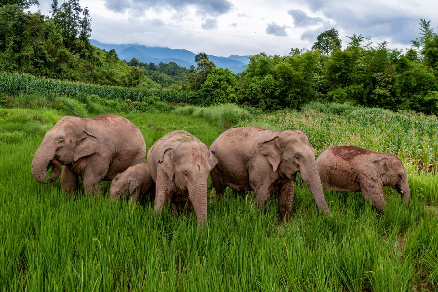 This aerial photo taken on July 19, 2023 shows wild Asian elephants foraging in a rice field in Jiangcheng County, southwest China's Yunnan Province. (Xinhua/Chen Xinbo)