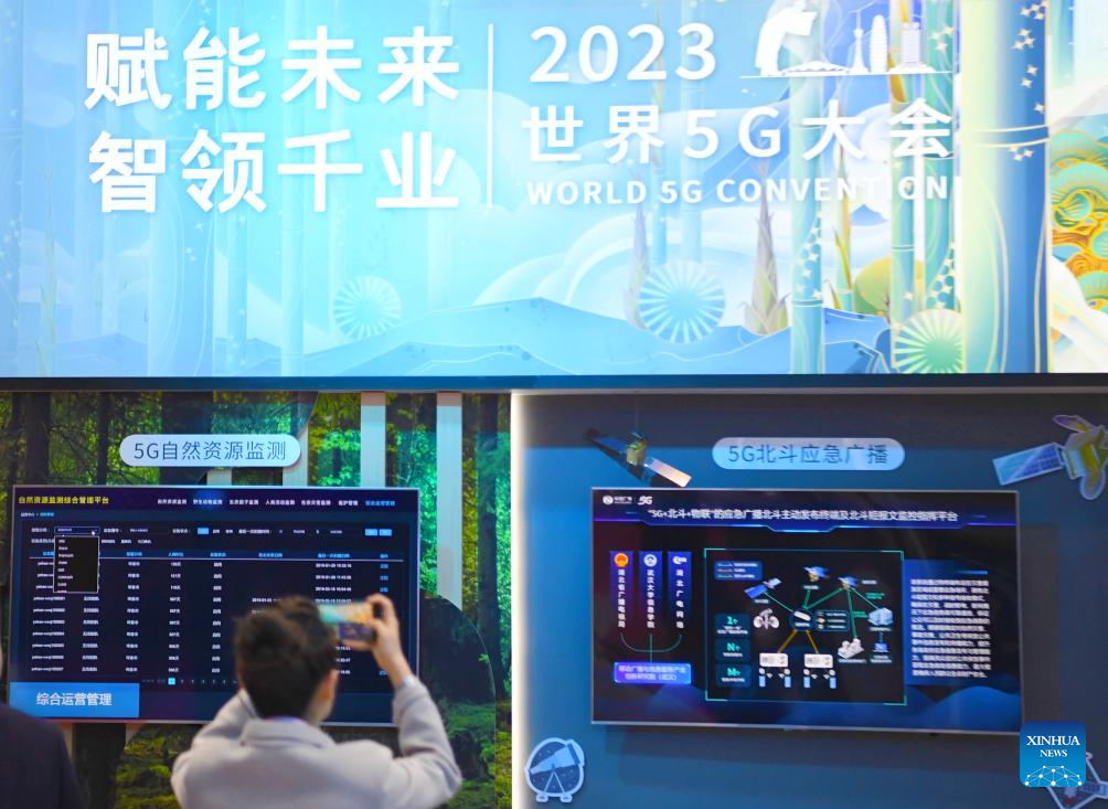 A visitor takes photo at the World 5G Convention in Zhengzhou, central China's Henan Province, Dec. 6, 2023. The World 5G Convention kicked off here on Wednesday. (Xinhua/Hao Yuan)