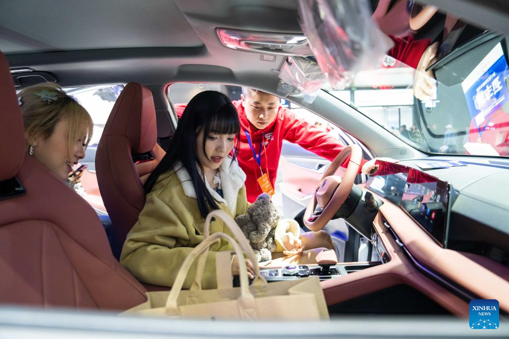People try a car during an automobile exposition at the Changsha International Convention and Exhibition Center in Changsha, central China's Hunan Province, Dec. 6, 2023. The 19th China (Changsha) International Automobile Exposition opened here on Wednesday, which gathers products from more than 80 automobile-related brands in an exhibition area of 100,000 square meters. (Xinhua/Chen Sihan)