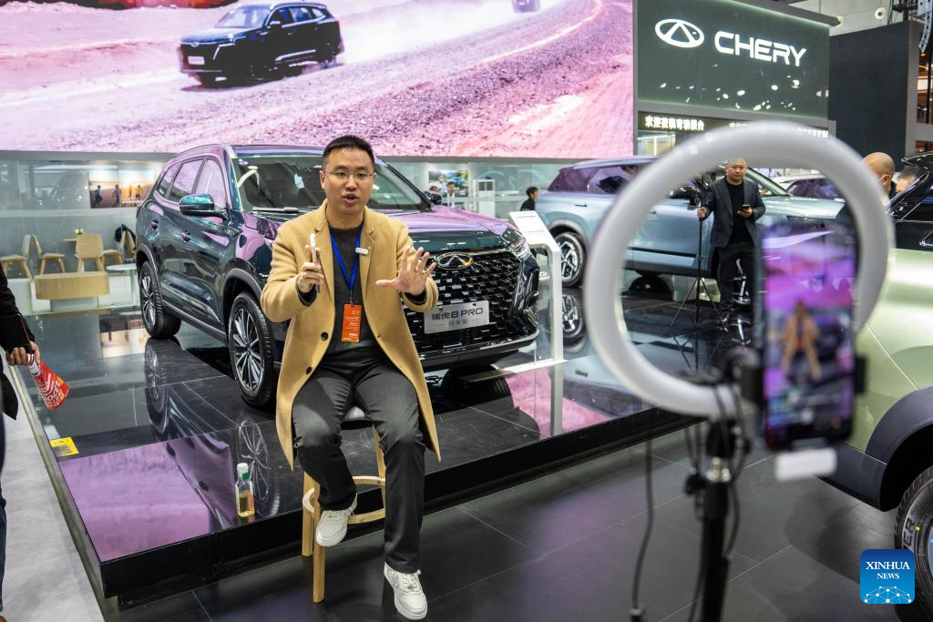 A man performs livestreaming during an automobile exposition at the Changsha International Convention and Exhibition Center in Changsha, central China's Hunan Province, Dec. 6, 2023. The 19th China (Changsha) International Automobile Exposition opened here on Wednesday, which gathers products from more than 80 automobile-related brands in an exhibition area of 100,000 square meters. (Xinhua/Chen Sihan)
