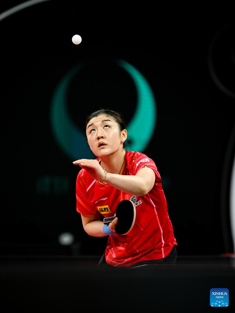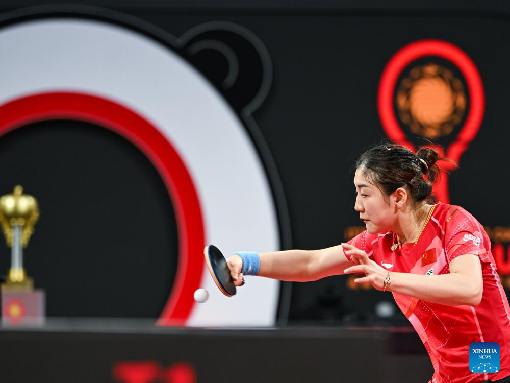 Chen Meng of China hits a return during the stage 2 women's singles match against Chen Ying-Chen of Chinese Taipei at the ITTF Mixed Team World Cup 2023 in Chengdu, southwest China's Sichuan Province, Dec. 7, 2023. (Xinhua/Wang Xi)
