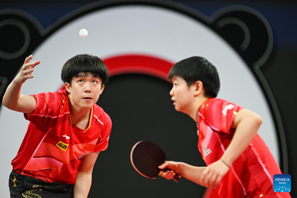 Wang Chuqin (L)/Sun Yingsha of China compete during the stage 2 mixed doubles match against Yang Chia-An/Li Yu-Jhun of Chinese Taipei at the ITTF Mixed Team World Cup 2023 in Chengdu, southwest China's Sichuan Province, Dec. 7, 2023. (Xinhua/Wang Xi)