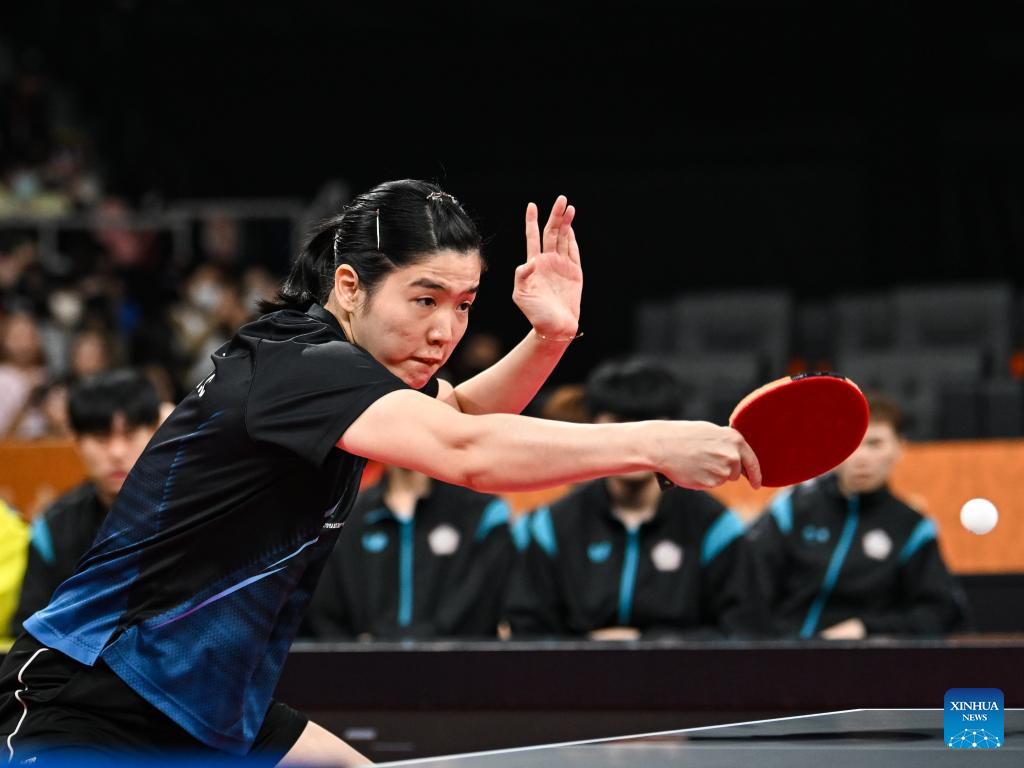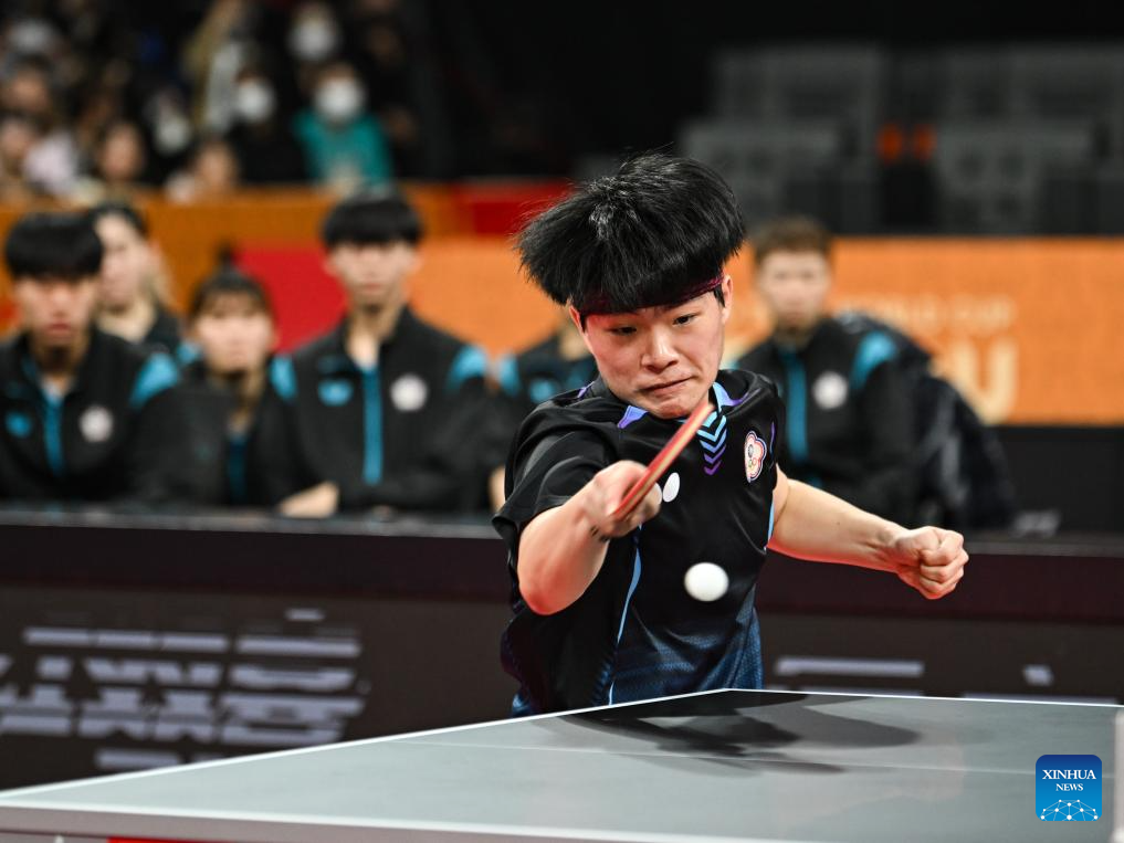 Chen Ying-Chen of Chinese Taipei hits a return during the stage 2 women's singles against Chen Meng of China at the ITTF Mixed Team World Cup 2023 in Chengdu, southwest China's Sichuan Province, Dec. 7, 2023. (Xinhua/Wang Xi)