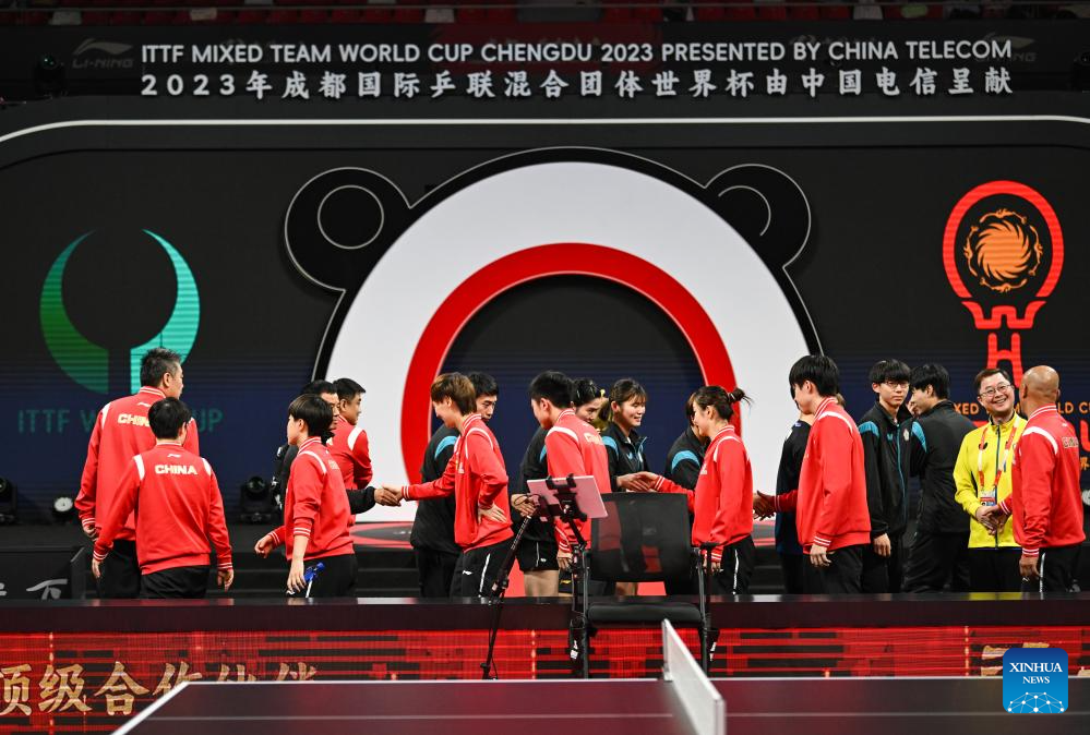 Players of China and Chinese Taipei greet each other after their stage 2 match at the ITTF Mixed Team World Cup 2023 in Chengdu, southwest China's Sichuan Province, Dec. 7, 2023. (Xinhua/Wang Xi)