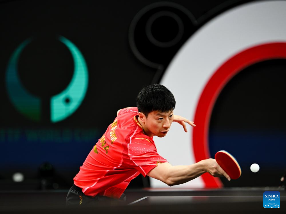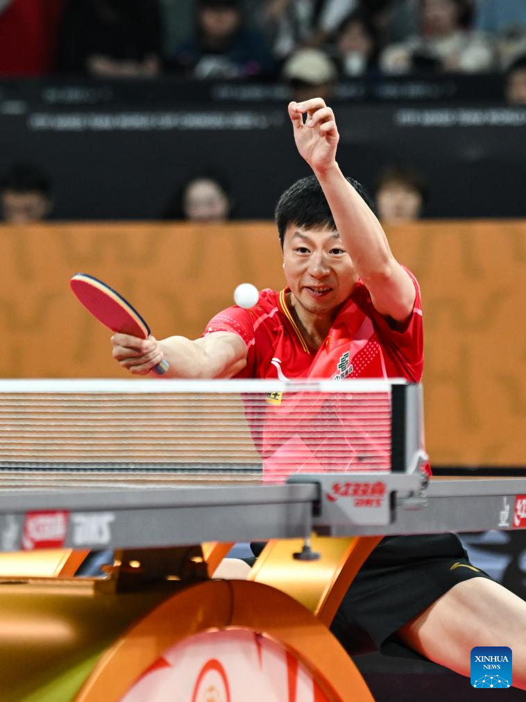 Ma Long of China hits a return during the stage 2 men's singles match against Lin Yen-Chun of Chinese Taipei at the ITTF Mixed Team World Cup 2023 in Chengdu, southwest China's Sichuan Province, Dec. 7, 2023. (Xinhua/Wang Xi)