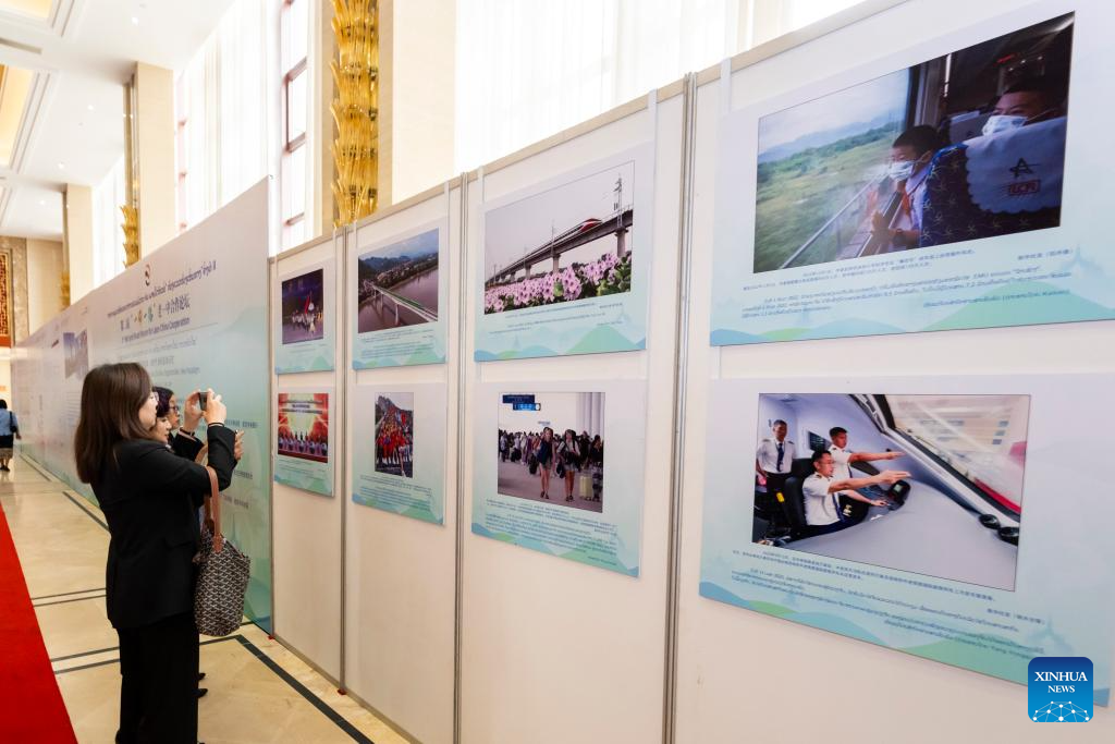People visit a photo exhibition on the achievements of the China-Laos community with a shared future in Vientiane, Laos, Dec. 7, 2023. The second Belt and Road Forum for Laos-China Cooperation kicked off here Thursday to discuss the implementation of the outcomes of the meeting between the top leaders of the two parties and the two countries, and the building of the China-Laos community with a shared future. (Xinhua/Zhu Wei)