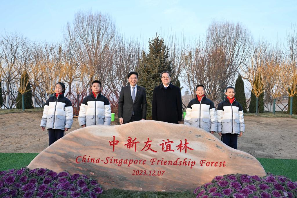 Ding Xuexiang, member of the Standing Committee of the Political Bureau of the Communist Party of China Central Committee and vice premier of the State Council, poses for a group photo with Deputy Prime Minister and Minister for Finance of the Republic of Singapore Lawrence Wong in front of the China-Singapore Friendship Forest in Tianjin, north China, Dec. 7, 2023. Ding and Wong co-chaired the 19th meeting of the China-Singapore Joint Council for Bilateral Cooperation, the 24th meeting of China-Singapore Suzhou Industrial Park Joint Steering Council (JSC), the 15th meeting of the China-Singapore Tianjin Eco-City JSC and the seventh meeting of the China-Singapore (Chongqing) Demonstration Initiative on Strategic Connectivity JSC. (Xinhua/Yue Yuewei)